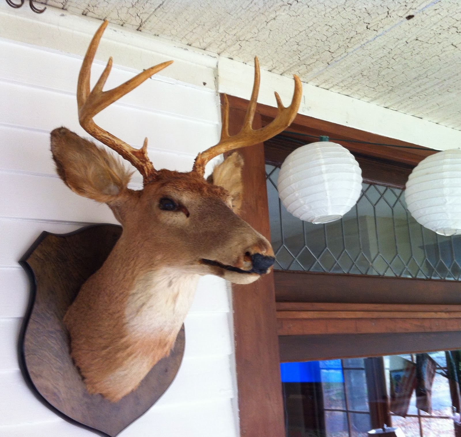 I had a friend buy a deer head for me years and years ago at an auction.  When I was dating Ed his brother in law was at my house and he asked me "Jenny, did you kill it?"  Makes me laugh.  They live out in the country and I guess it could be possible that I would sit in a tree and hunt.  But, this gal doesn't hunt.  I got it so I could decorate it.  This guy is going to get in the Christmas spirit real soon.